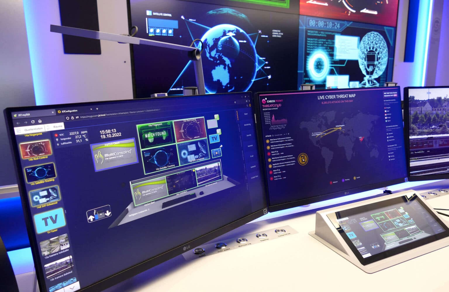 Steuern Sie Ihren Kontrollraum komfortabel mit myGUI® von Jungmann Systemtechnik (JST). Diese innovative Bedienoberfläche visualisiert Ihr Leitstand-Layout in 3D und ermöglicht die Steuerung sämtlicher Systeme mit Maus, Touch, CommandPad oder Sprache. Ob Licht, Klima oder Videotechnik – alles ist mit wenigen Klicks erreichbar. Genießen Sie höchste Bedienfreundlichkeit und bleiben Sie auch in stressigen Situationen souverän.